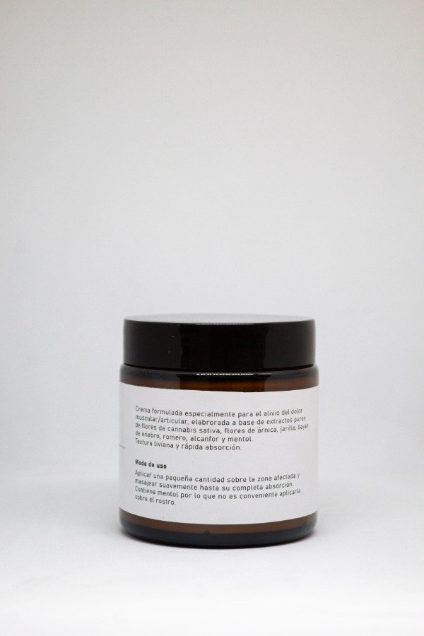 AGUA BIDESTILADA- HIDROLATOS DE ROMERO Y ENEBRO, TINTURA DE FLORES DE ÁRNICA- OLEATO DE CANNABIS SATIVA EN ACEITE DE OLIVA VIRGEN EXTRAACEITE DE COCO - ALCANFOR- CERA LANETTE N- MENTOL EN CRISTALES- MANTECA DE KARITÈ- ACEITES ESENCIALES DE ROMERO Y DE ENEBRO. VITAMINA E- CONSERVANTE.