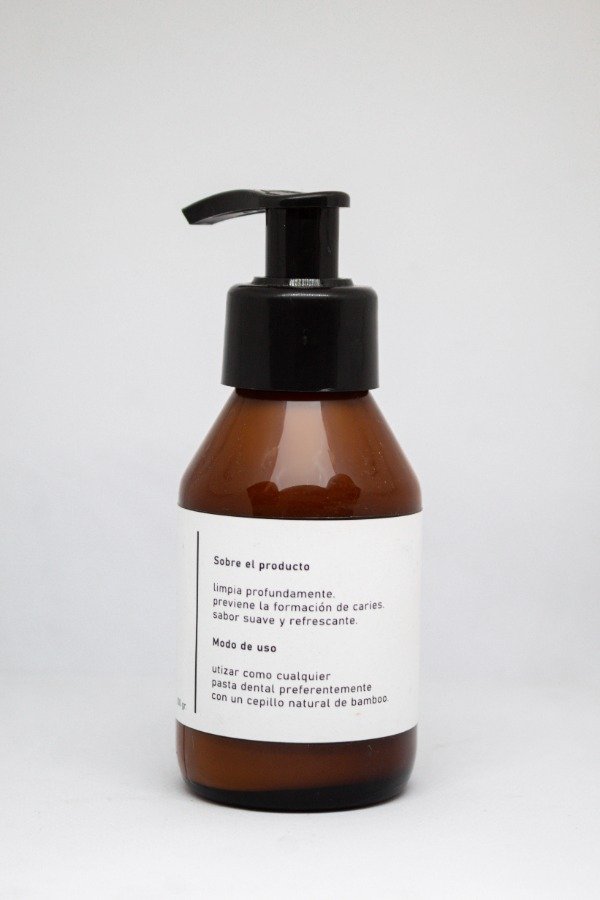 Gel dental elaborado con hidrolato de Menta , Carbonato de Calcio como agente limpiador y remineralizante, Xilitol preventivo de la formación de caries; extracto de Aloe Vera , efectivo para eliminar el sarro dental; extracto de Canela con propiedades bactericida y conservante y aceite esencial de Menta de nuestra producción